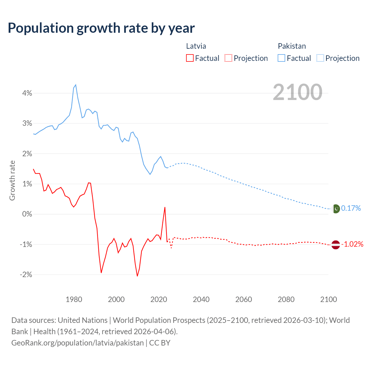 - For the last 10 years, Latvia has had an average growth rate of -0.68% per year vs +1.6% in Pakistan.