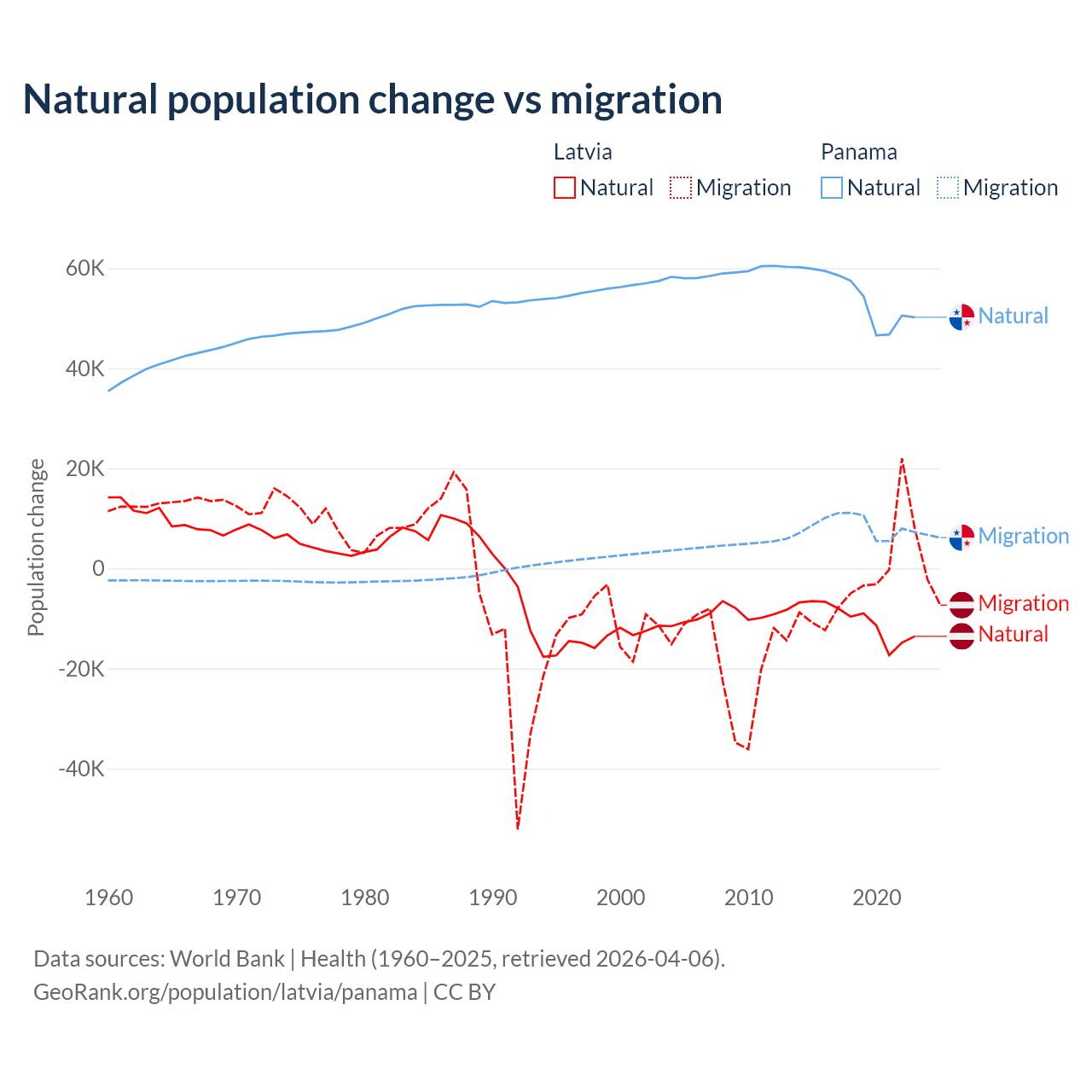 Over the last 10 years, 82.7% of the population change in Latvia is from natural causes (a loss of 103,711 people) and 17.3% is from migration (a loss of 21,641 people). In Panama 86.5% is from natural causes (a gain of 544,211 people) and 13.5% is from migration (a gain of 84,849 people).