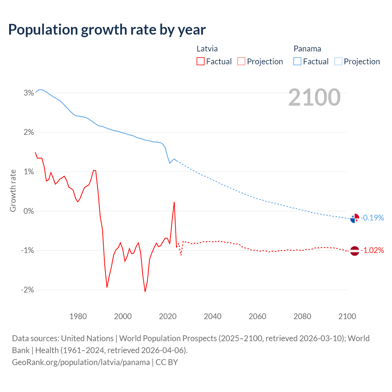 - For the last 10 years, Latvia has had an average growth rate of -0.68% per year vs +1.52% in Panama.