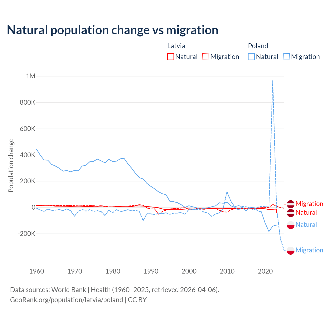 Over the last 10 years, 82.7% of the population change in Latvia is from natural causes (a loss of 103,711 people) and 17.3% is from migration (a loss of 21,641 people). In Poland 41.4% is from natural causes (a loss of 675,443 people) and 58.6% is from migration (a gain of 955,766 people).