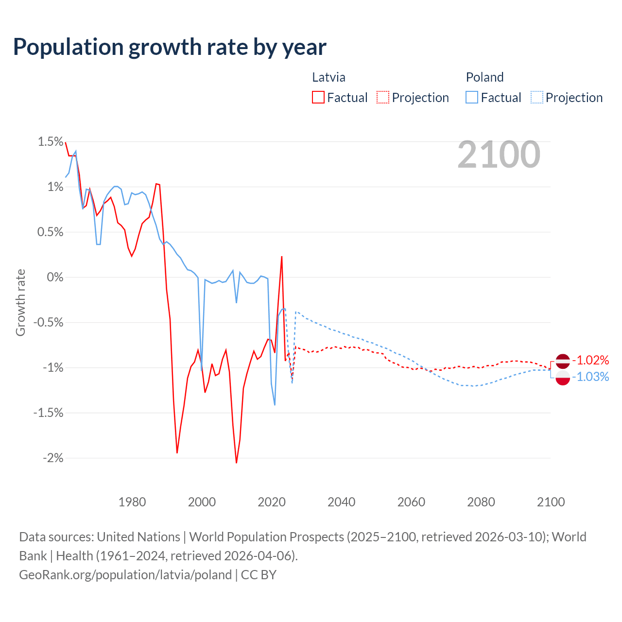 - For the last 10 years, Latvia has had an average growth rate of -0.68% per year vs -0.36% in Poland.