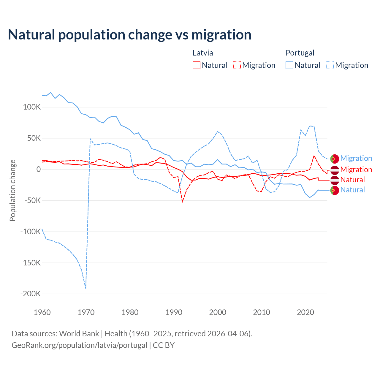 Over the last 10 years, 82.7% of the population change in Latvia is from natural causes (a loss of 103,711 people) and 17.3% is from migration (a loss of 21,641 people). In Portugal 51% is from natural causes (a loss of 302,748 people) and 49% is from migration (a gain of 290,554 people).