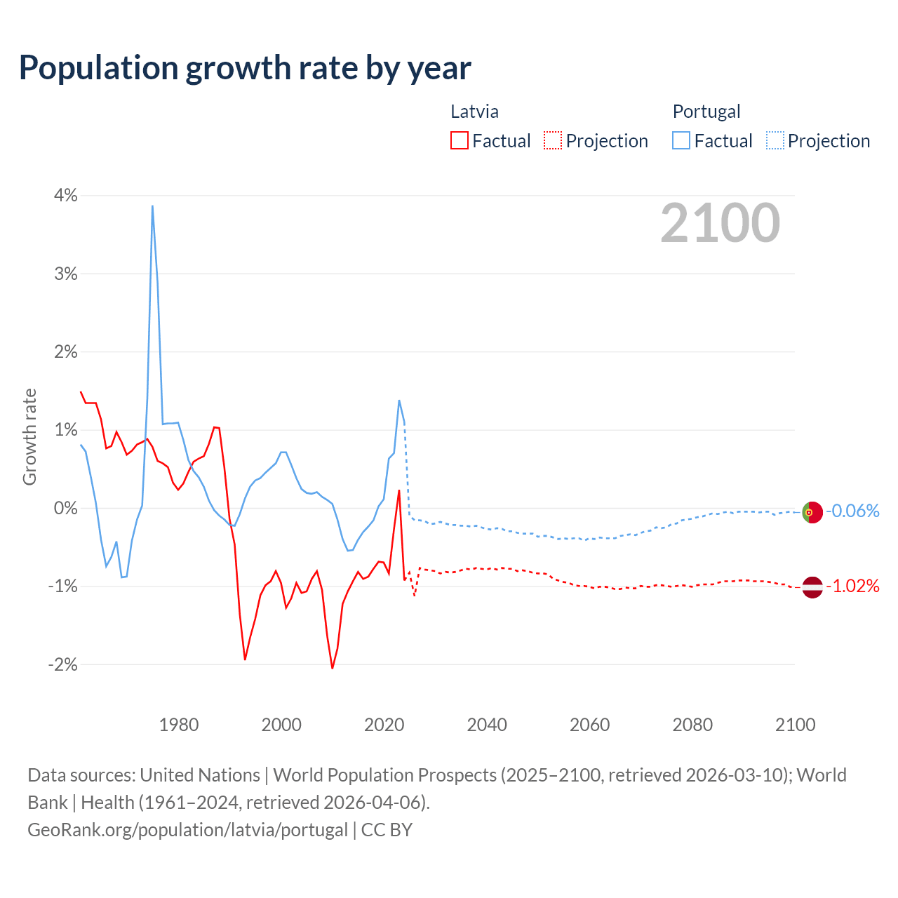 - For the last 10 years, Latvia has had an average growth rate of -0.68% per year vs +0.21% in Portugal.