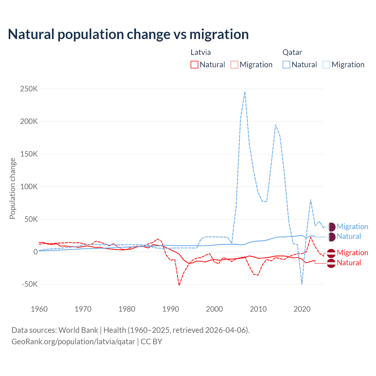 Over the last 10 years, 82.7% of the population change in Latvia is from natural causes (a loss of 103,711 people) and 17.3% is from migration (a loss of 21,641 people). In Qatar 26.1% is from natural causes (a gain of 232,009 people) and 73.9% is from migration (a gain of 655,712 people).