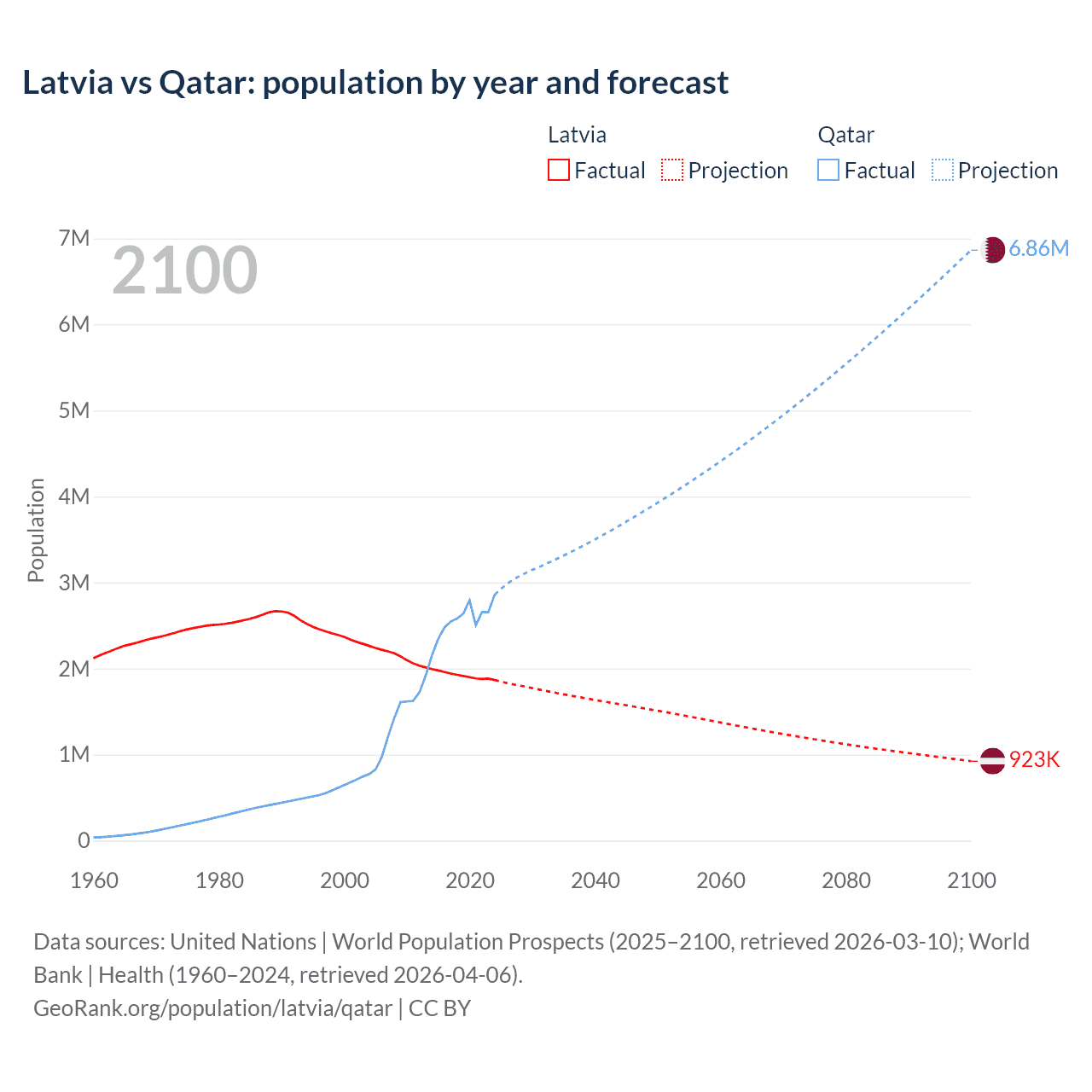 The latest officially reported population of Latvia was 1,866,124 in 2024 vs 2,857,822 people in Qatar in 2024. In 2026, based on the adjusted UN estimation, the current Latvia's population is 1,829,763 people compared to 2,999,260 in Qatar.