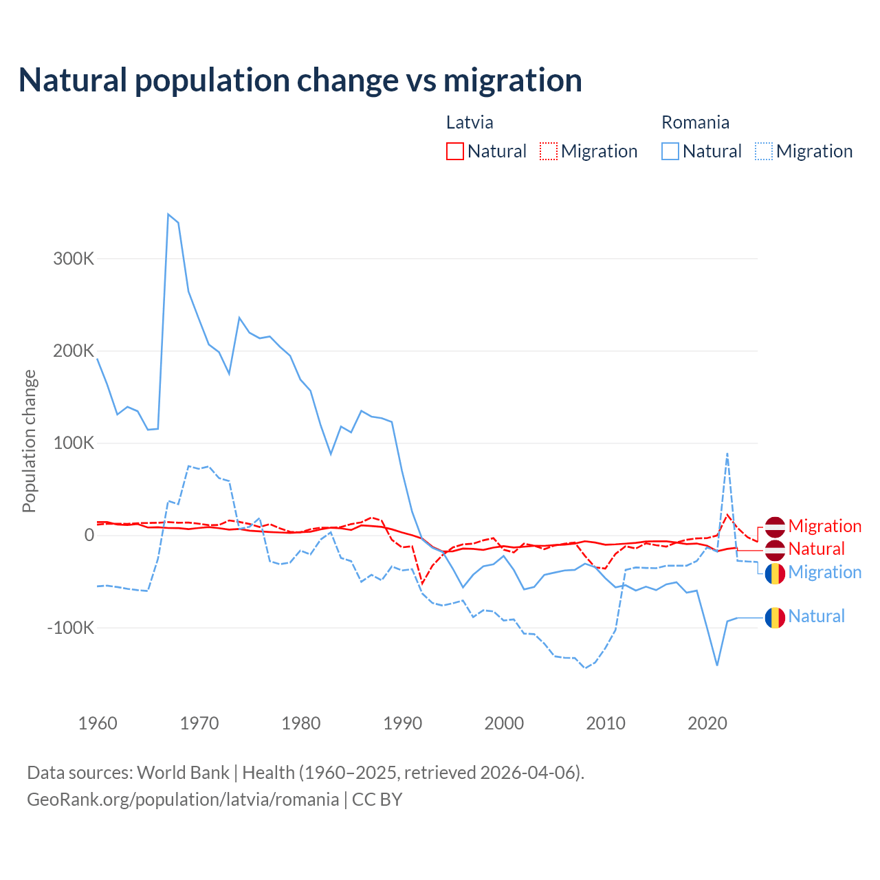 Over the last 10 years, 82.7% of the population change in Latvia is from natural causes (a loss of 103,711 people) and 17.3% is from migration (a loss of 21,641 people). In Romania 82% is from natural causes (a loss of 766,295 people) and 18% is from migration (a loss of 167,917 people).