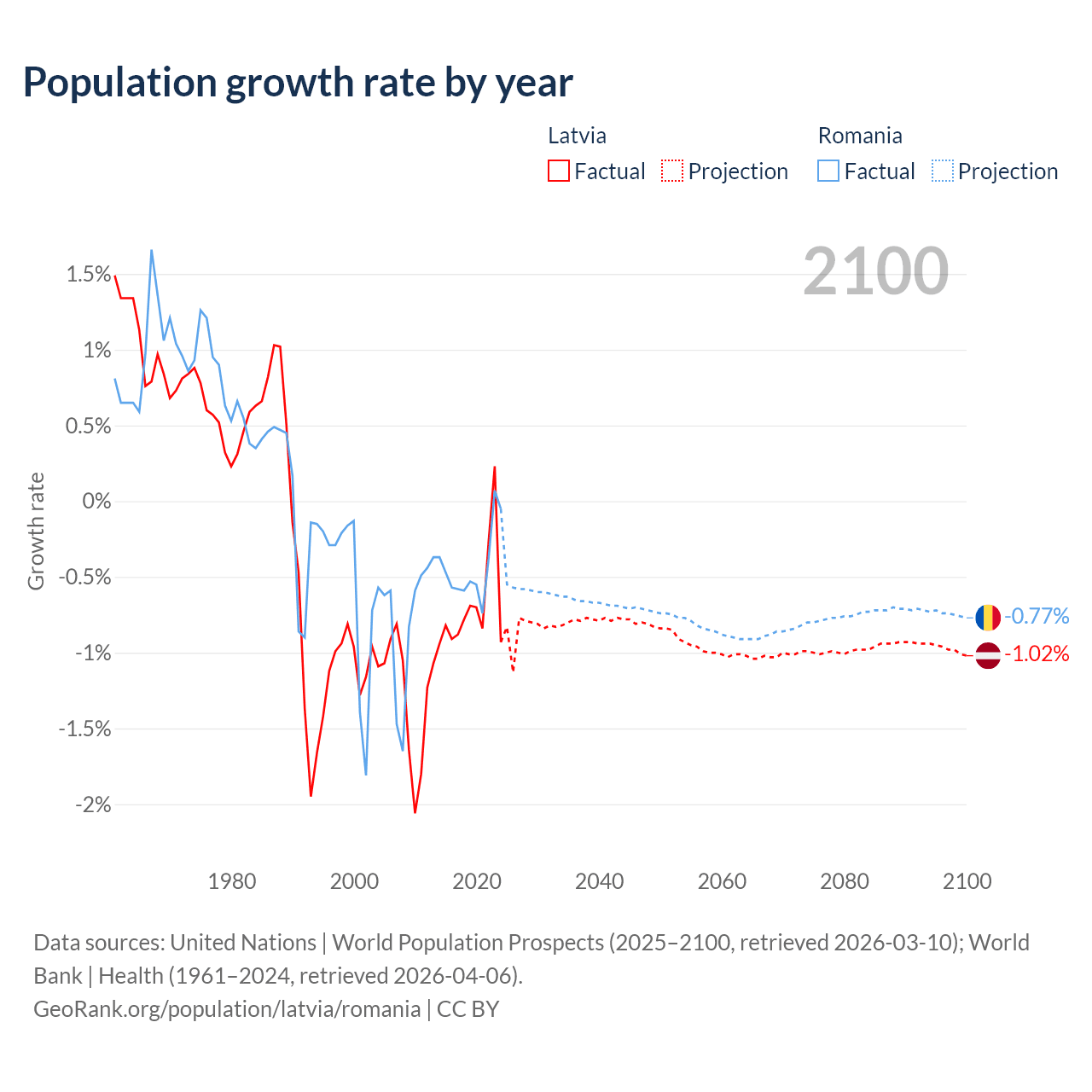 - For the last 10 years, Latvia has had an average growth rate of -0.68% per year vs -0.43% in Romania.
