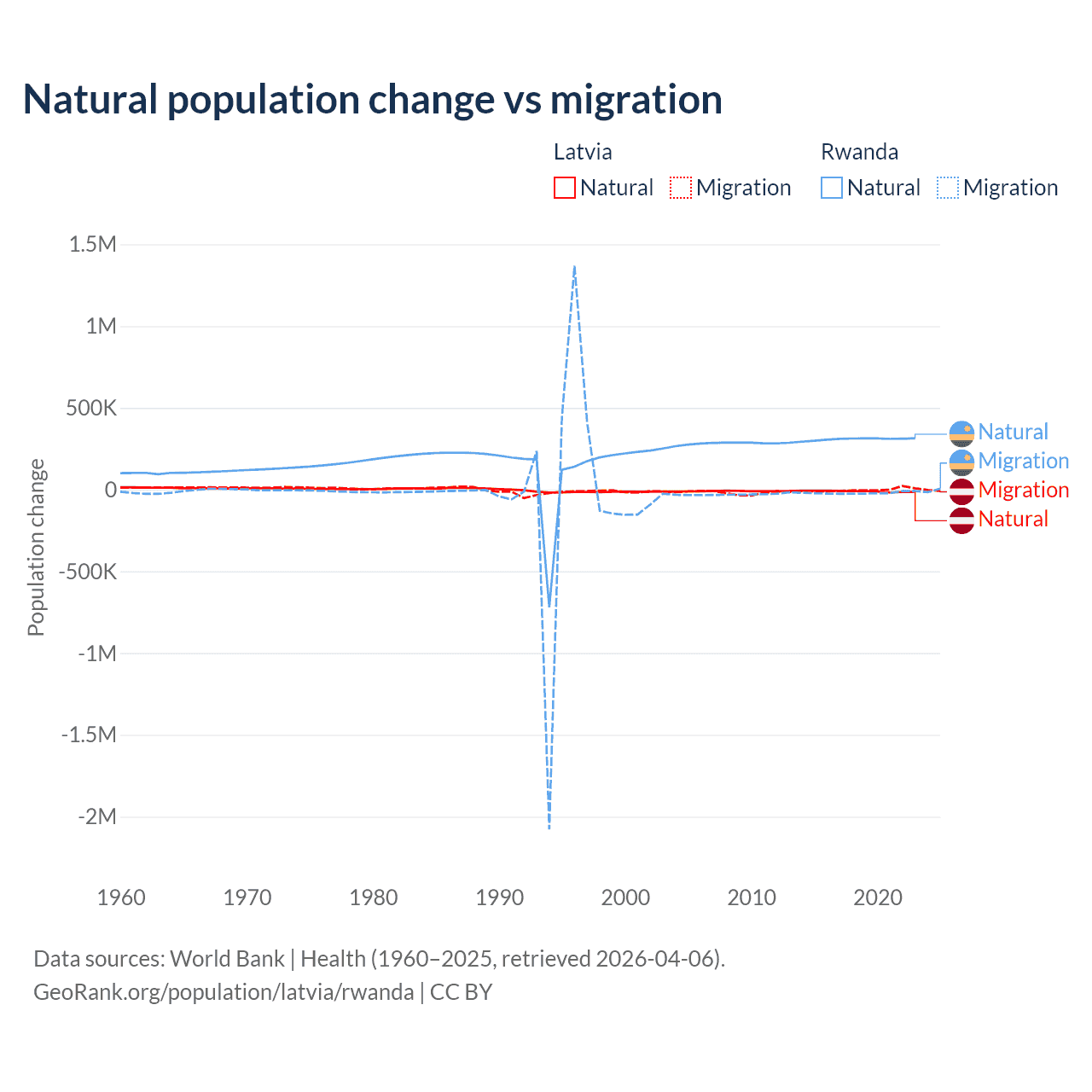 Over the last 10 years, 82.7% of the population change in Latvia is from natural causes (a loss of 103,711 people) and 17.3% is from migration (a loss of 21,641 people). In Rwanda 93.8% is from natural causes (a gain of 3,081,296 people) and 6.18% is from migration (a loss of 203,035 people).