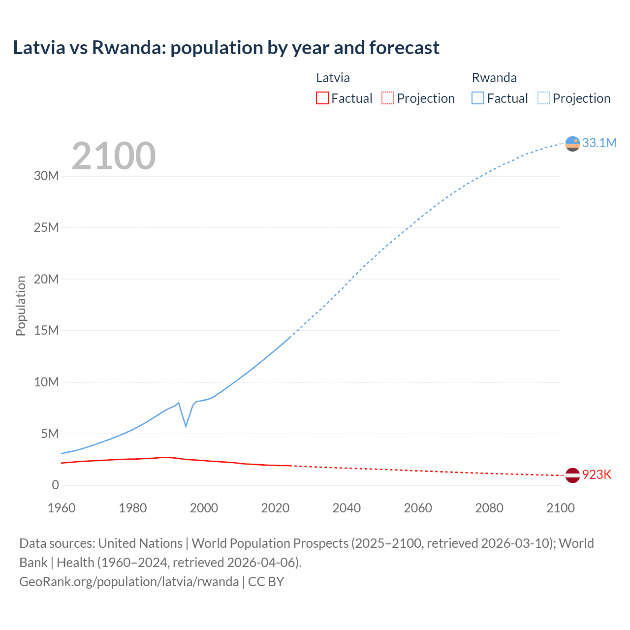 - Since 2006, the population of Latvia has decreased from 2.22M people to 1.83M (17.5% decline), while Rwanda has grown from 9.3M to 15M (61% growth).