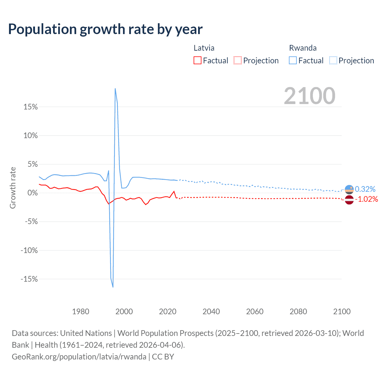 - For the last 10 years, Latvia has had an average growth rate of -0.68% per year vs +2.31% in Rwanda.