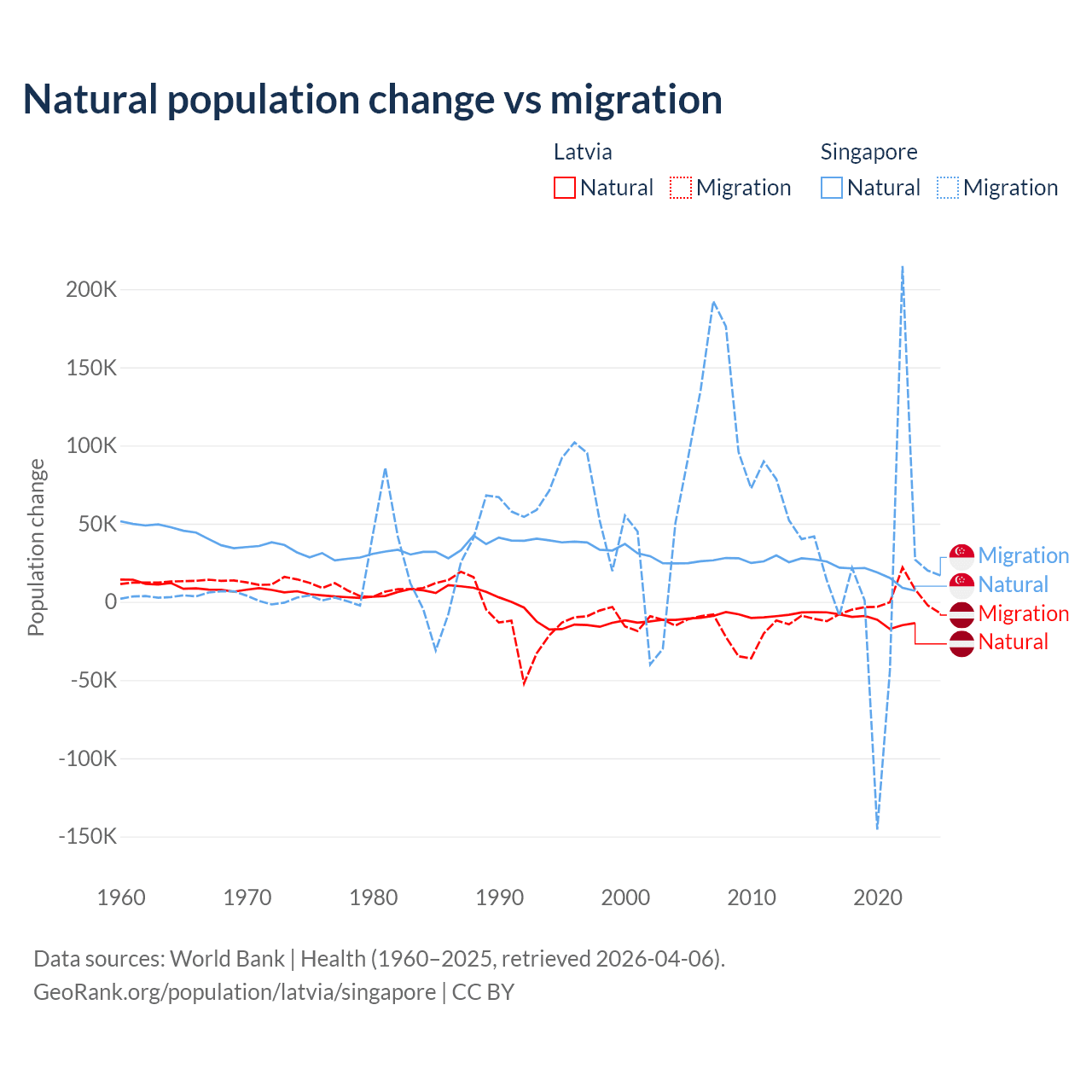 Over the last 10 years, 82.7% of the population change in Latvia is from natural causes (a loss of 103,711 people) and 17.3% is from migration (a loss of 21,641 people). In Singapore 54.8% is from natural causes (a gain of 195,953 people) and 45.2% is from migration (a gain of 161,805 people).