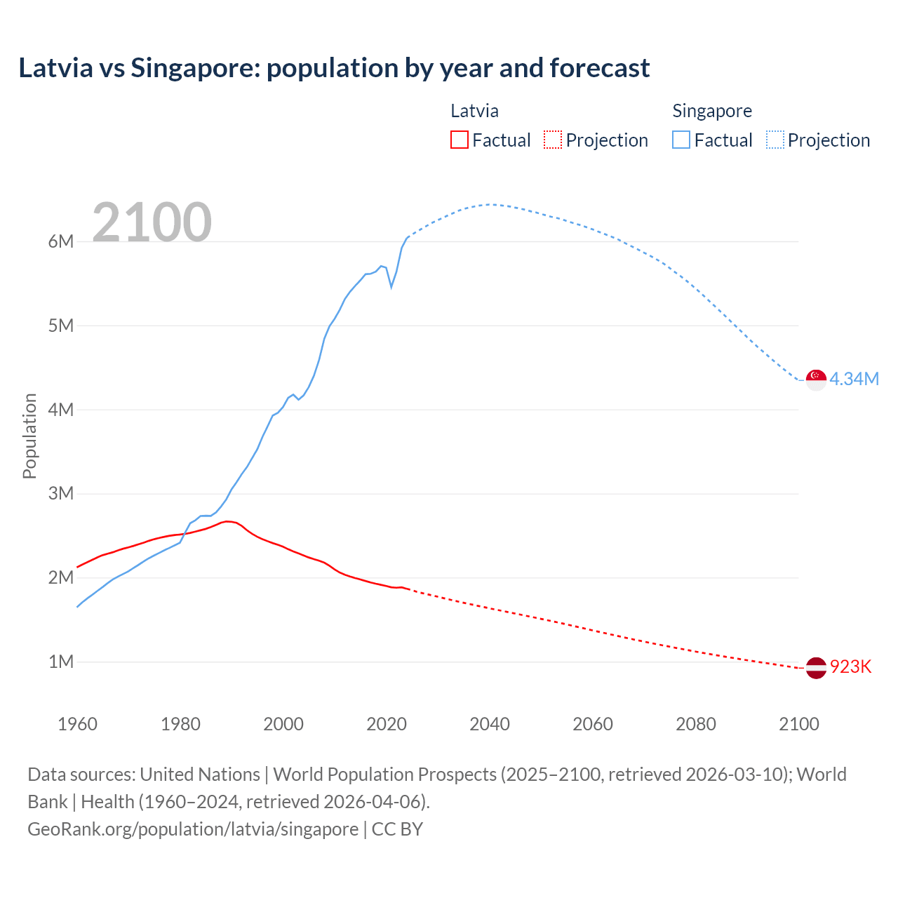 Latvia vs Singapore: population by year and forecast