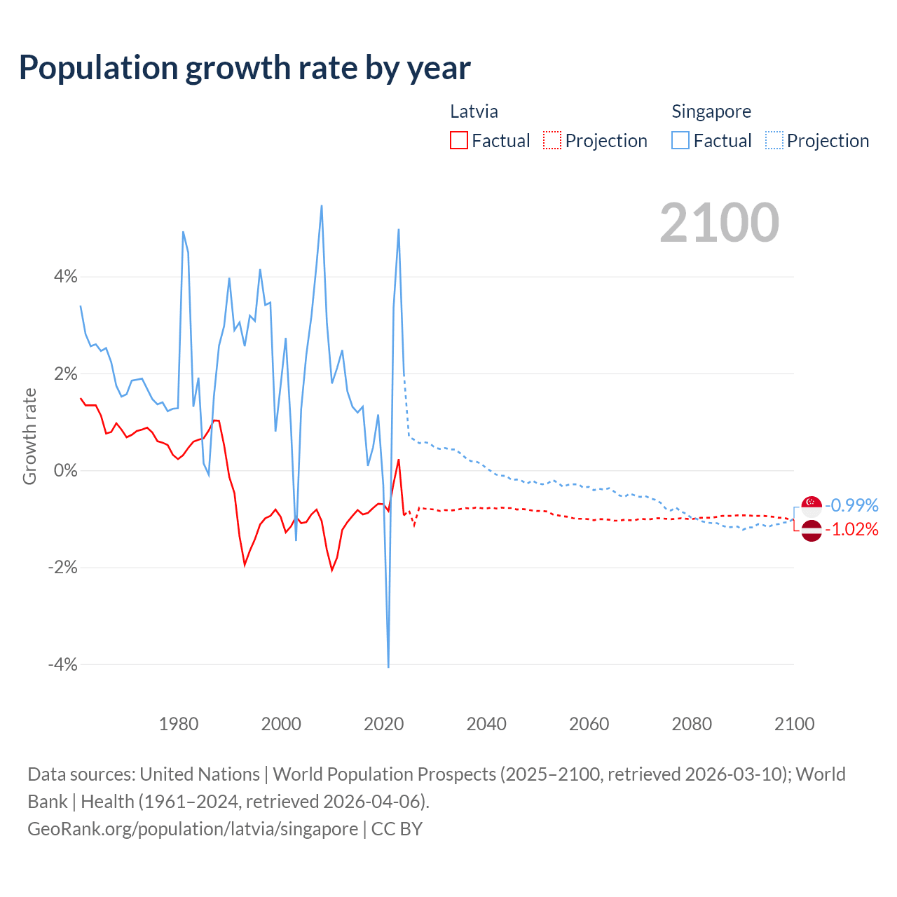 - For the last 10 years, Latvia has had an average growth rate of -0.68% per year vs +1.04% in Singapore.
