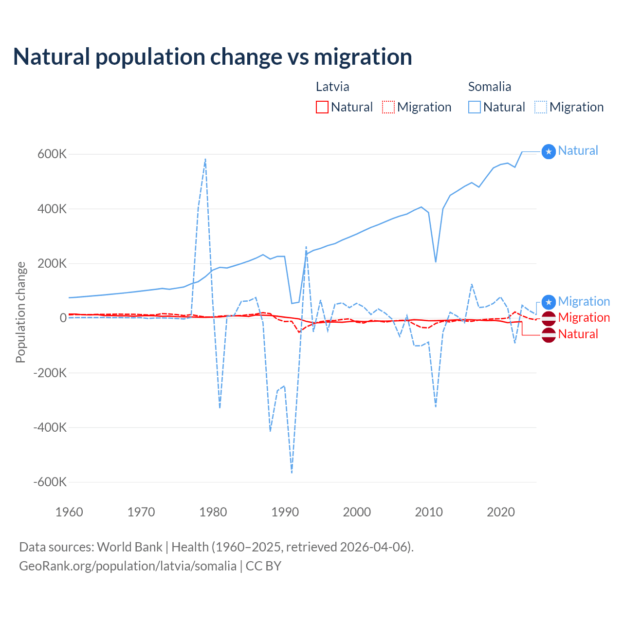 Over the last 10 years, 82.7% of the population change in Latvia is from natural causes (a loss of 103,711 people) and 17.3% is from migration (a loss of 21,641 people). In Somalia 94.4% is from natural causes (a gain of 5,270,105 people) and 5.58% is from migration (a gain of 311,487 people).