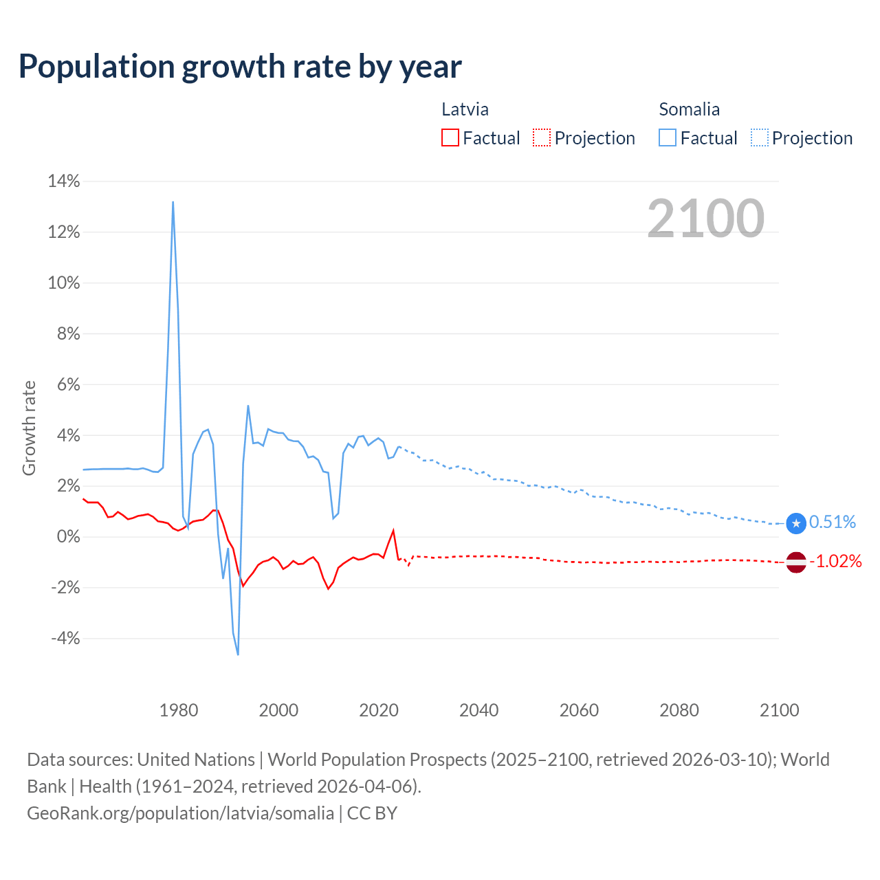 - For the last 10 years, Latvia has had an average growth rate of -0.68% per year vs +3.61% in Somalia.