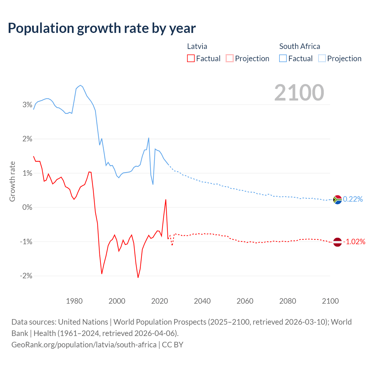 - For the last 10 years, Latvia has had an average growth rate of -0.68% per year vs +1.44% in South Africa.