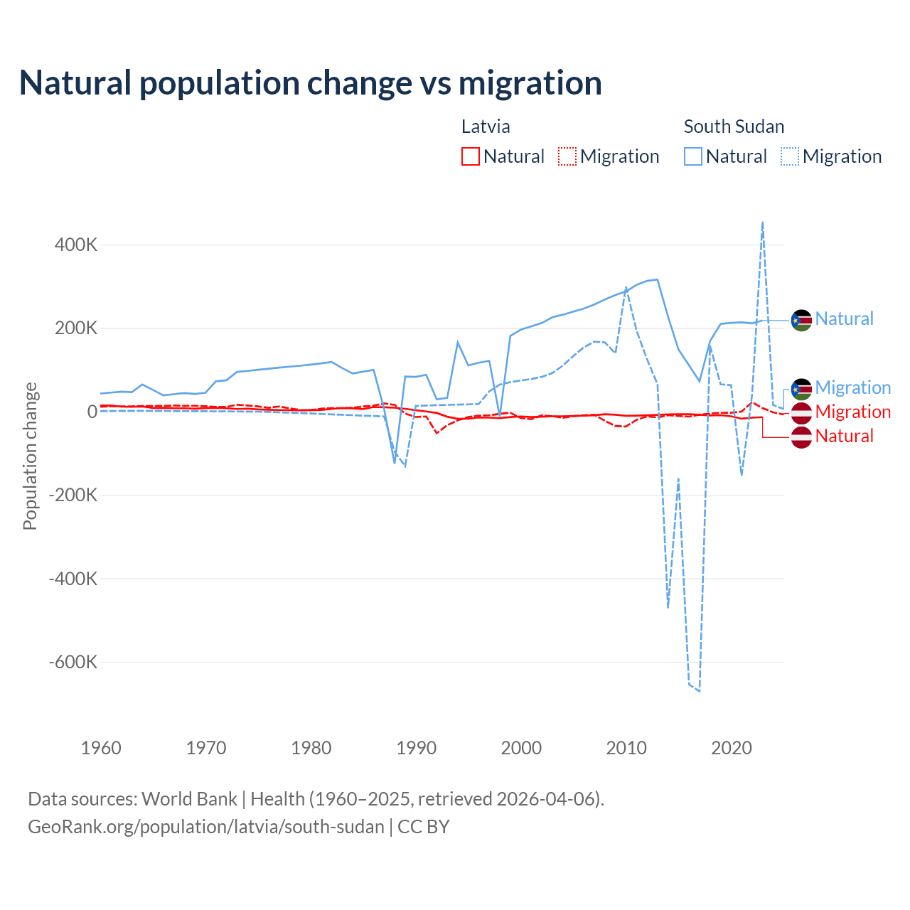 Over the last 10 years, 82.7% of the population change in Latvia is from natural causes (a loss of 103,711 people) and 17.3% is from migration (a loss of 21,641 people). In South Sudan 57.4% is from natural causes (a gain of 1,792,135 people) and 42.6% is from migration (a loss of 1,329,606 people).