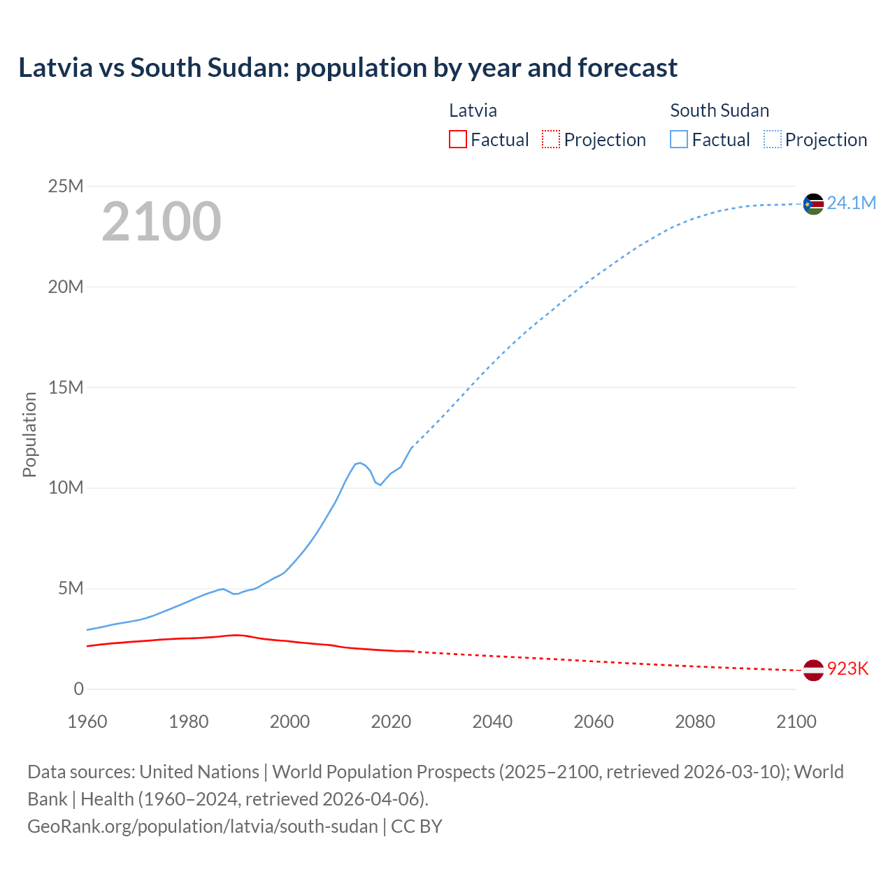 The latest officially reported population of Latvia was 1,866,124 in 2024 vs 11,943,408 people in South Sudan in 2024. In 2026, based on the adjusted UN estimation, the current Latvia's population is 1,829,763 people compared to 12,507,858 in South Sudan.