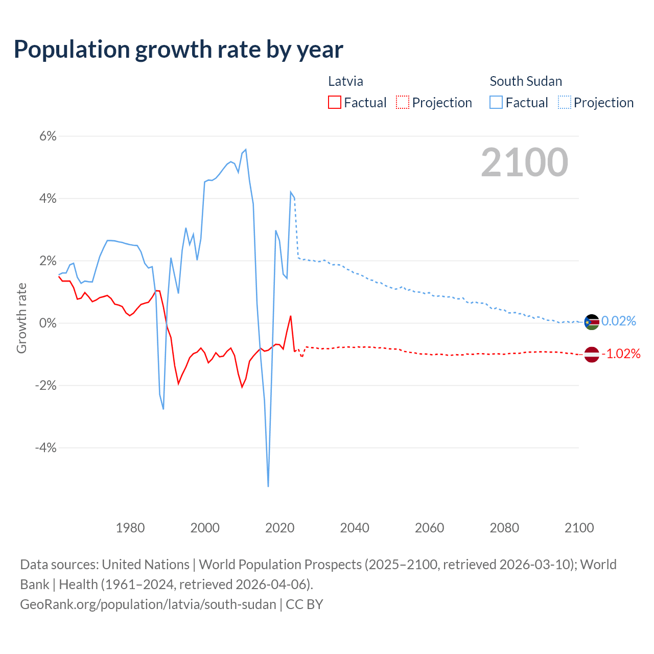 - For the last 10 years, Latvia has had an average growth rate of -0.68% per year vs +0.65% in South Sudan.