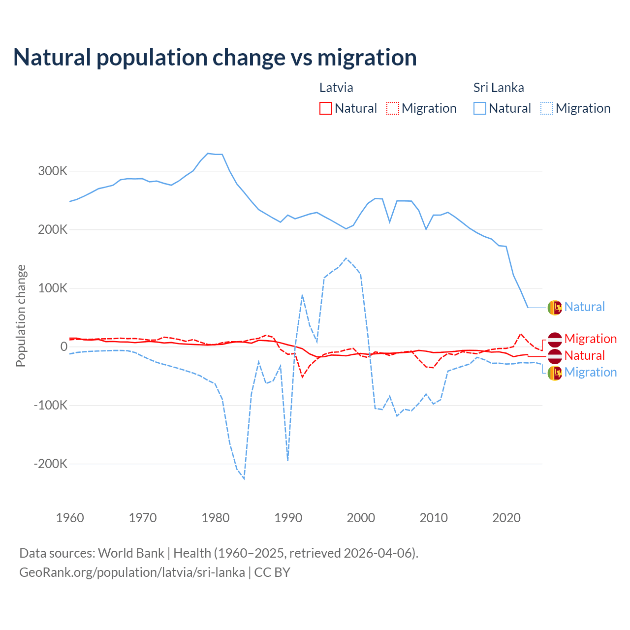Over the last 10 years, 82.7% of the population change in Latvia is from natural causes (a loss of 103,711 people) and 17.3% is from migration (a loss of 21,641 people). In Sri Lanka 85.3% is from natural causes (a gain of 1,605,749 people) and 14.7% is from migration (a loss of 276,121 people).