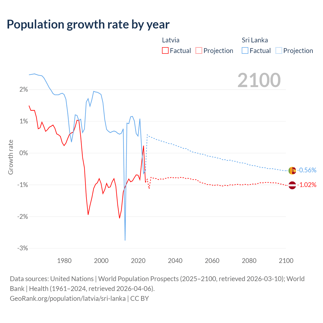- For the last 10 years, Latvia has had an average growth rate of -0.68% per year vs +0.57% in Sri Lanka.