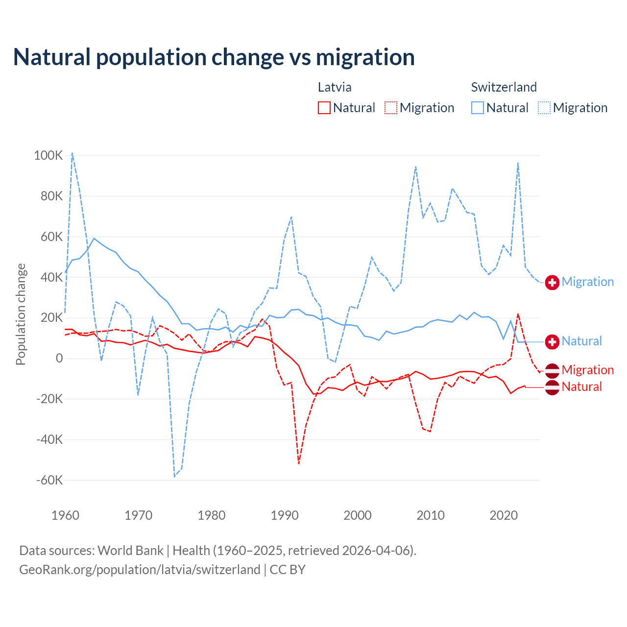 Over the last 10 years, 82.7% of the population change in Latvia is from natural causes (a loss of 103,711 people) and 17.3% is from migration (a loss of 21,641 people). In Switzerland 21.6% is from natural causes (a gain of 165,354 people) and 78.4% is from migration (a gain of 600,145 people).