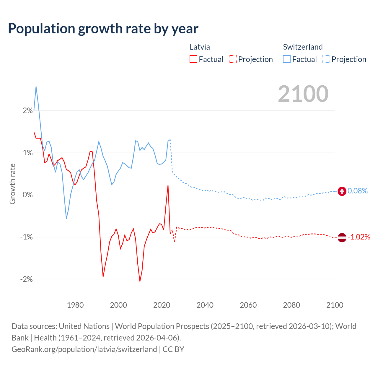- For the last 10 years, Latvia has had an average growth rate of -0.68% per year vs +0.98% in Switzerland.