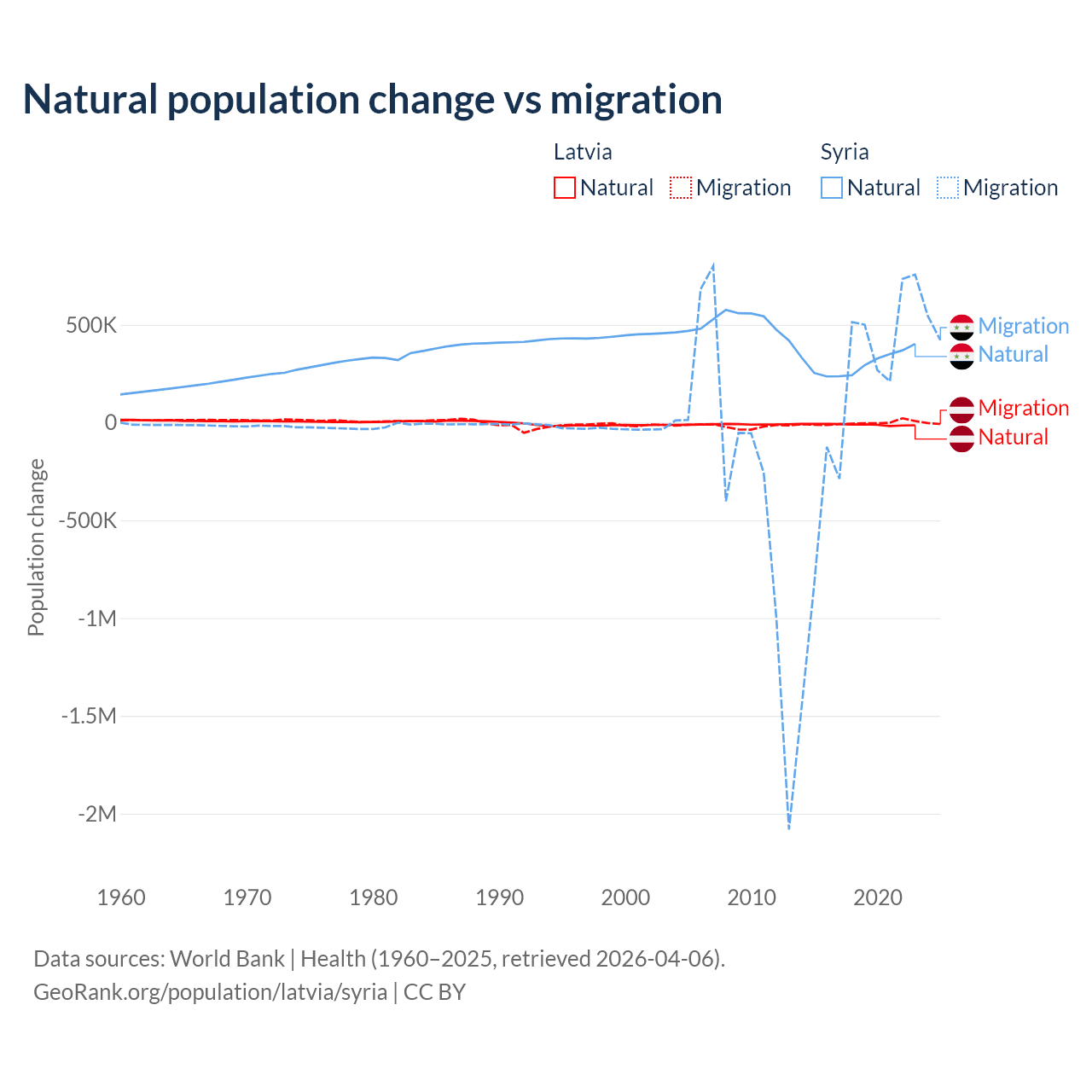 Over the last 10 years, 82.7% of the population change in Latvia is from natural causes (a loss of 103,711 people) and 17.3% is from migration (a loss of 21,641 people). In Syria 91.3% is from natural causes (a gain of 3,047,621 people) and 8.72% is from migration (a gain of 291,069 people).