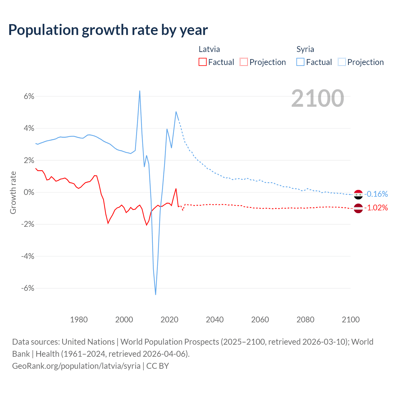 - For the last 10 years, Latvia has had an average growth rate of -0.68% per year vs +1.25% in Syria.