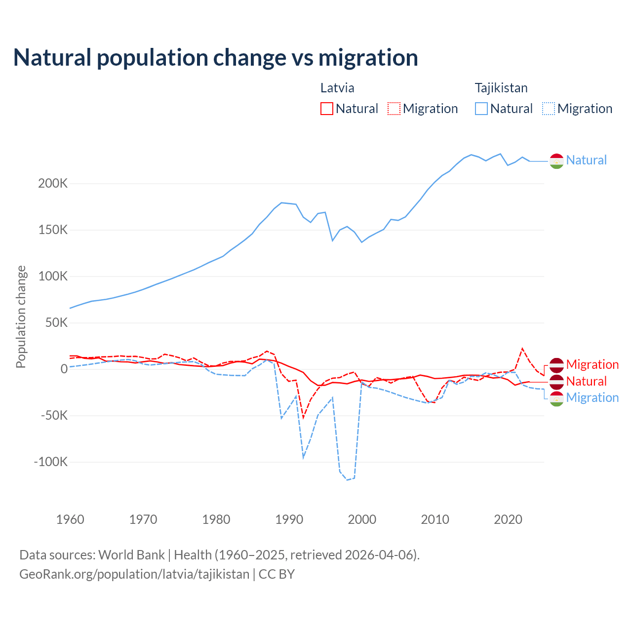 Over the last 10 years, 82.7% of the population change in Latvia is from natural causes (a loss of 103,711 people) and 17.3% is from migration (a loss of 21,641 people). In Tajikistan 96% is from natural causes (a gain of 2,266,045 people) and 3.95% is from migration (a loss of 93,205 people).
