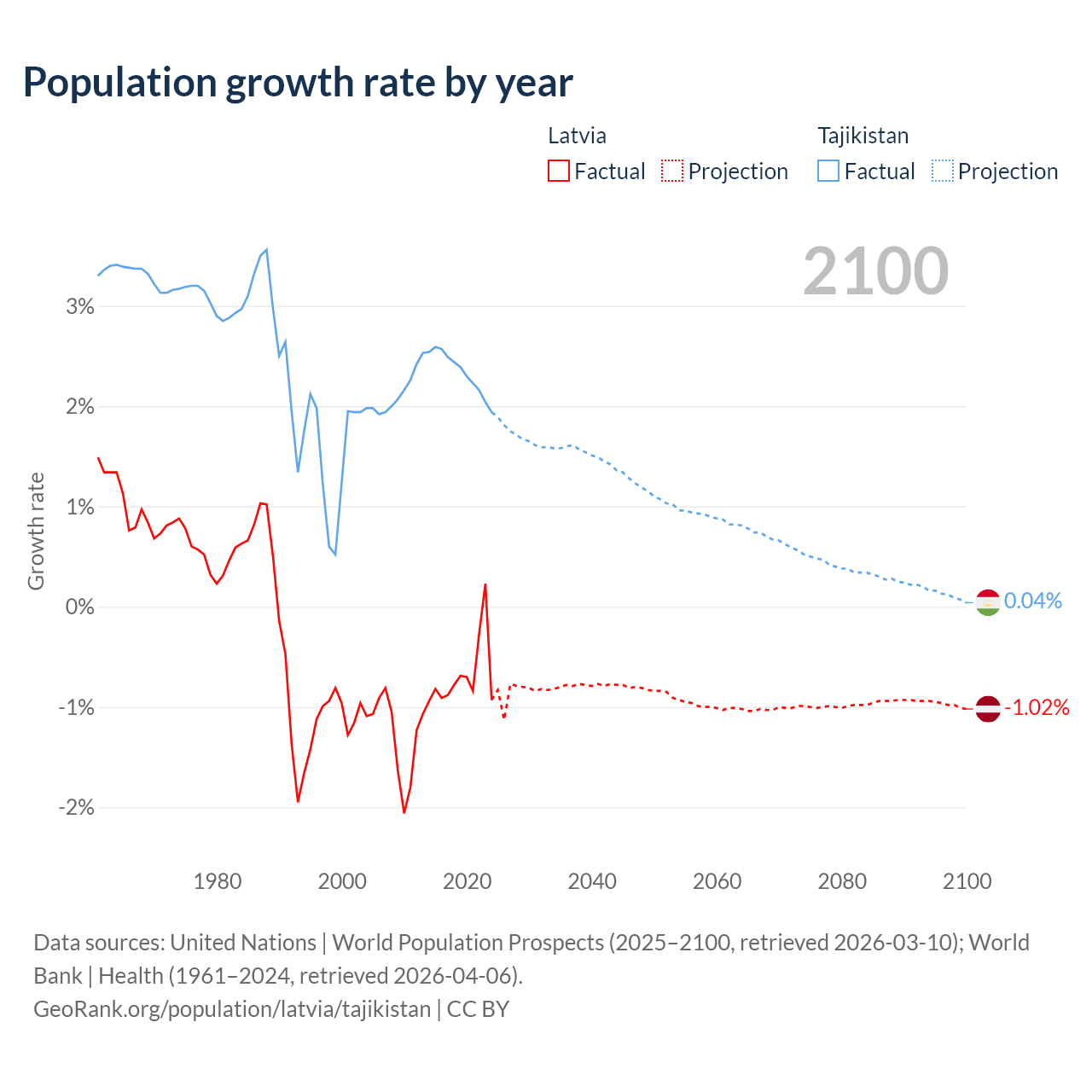 - For the last 10 years, Latvia has had an average growth rate of -0.68% per year vs +2.33% in Tajikistan.