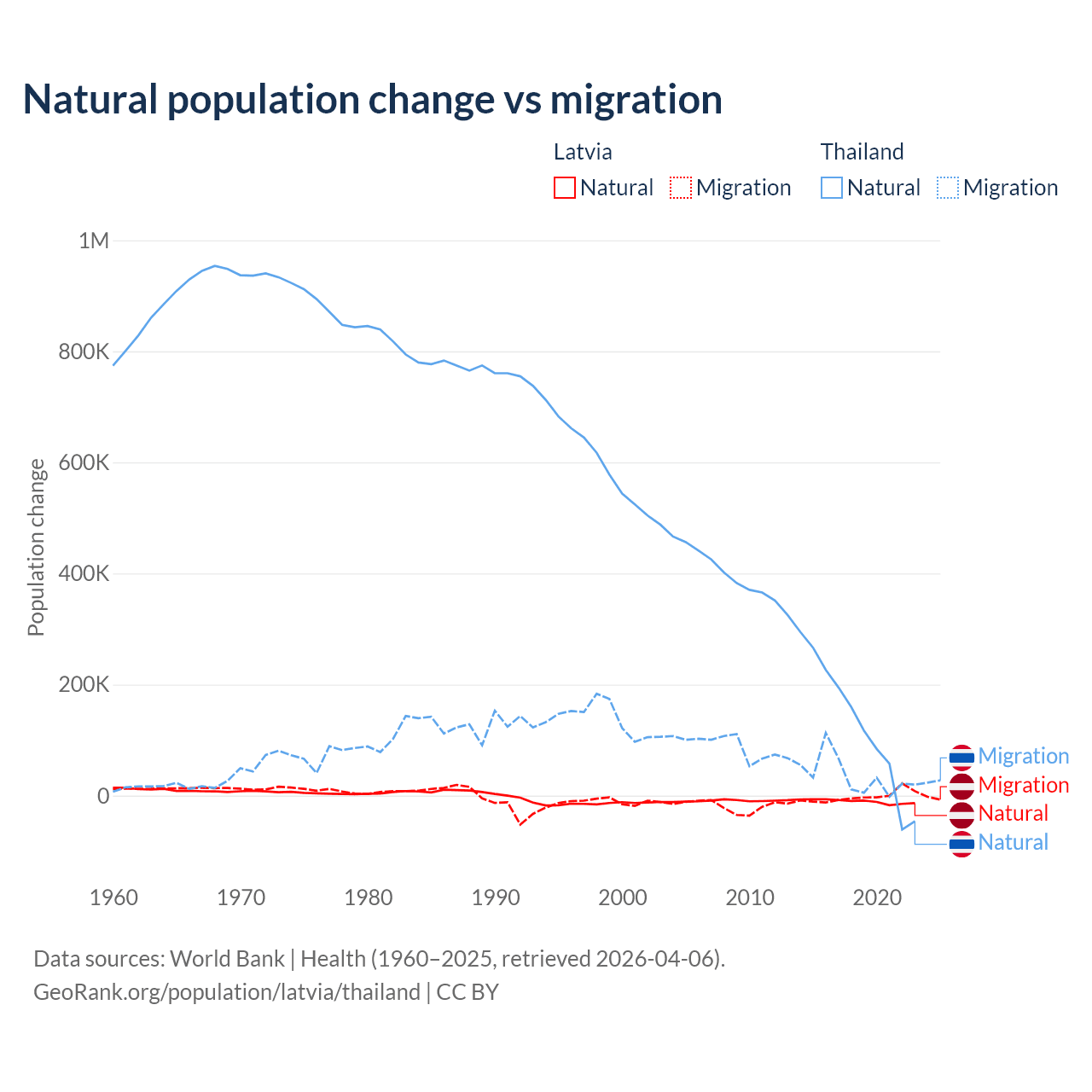 Over the last 10 years, 82.7% of the population change in Latvia is from natural causes (a loss of 103,711 people) and 17.3% is from migration (a loss of 21,641 people). In Thailand 78.4% is from natural causes (a gain of 1,292,528 people) and 21.6% is from migration (a gain of 355,361 people).