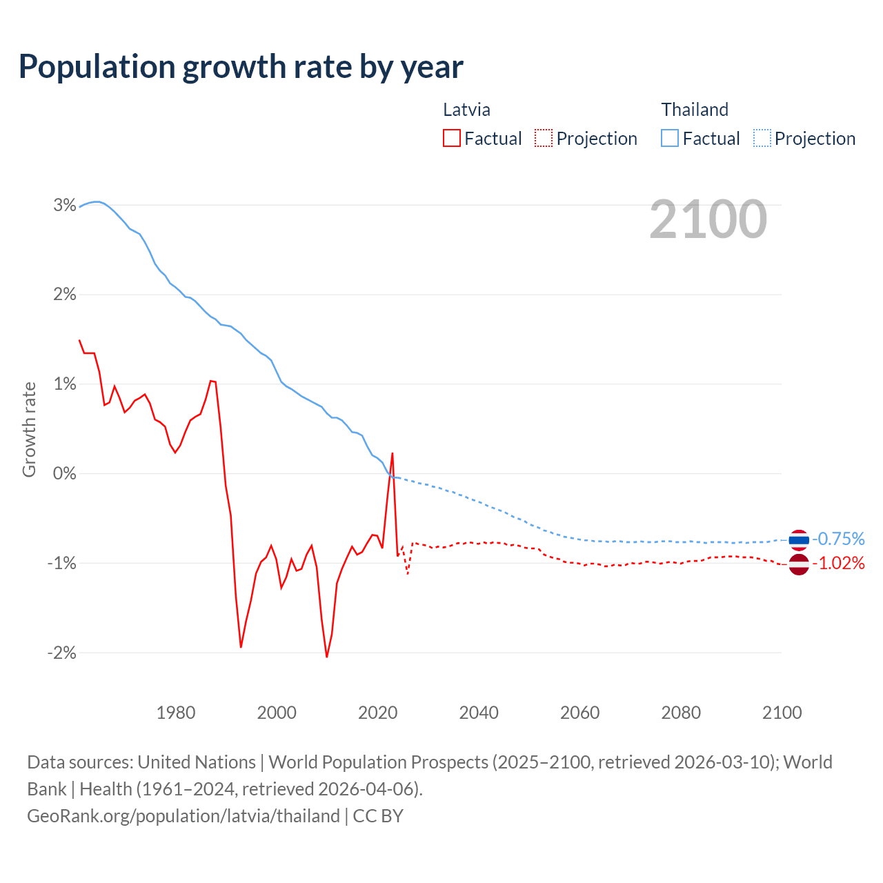 - For the last 10 years, Latvia has had an average growth rate of -0.68% per year vs +0.23% in Thailand.
