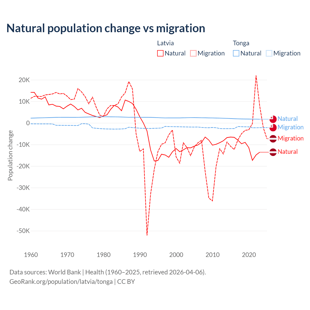 Over the last 10 years, 82.7% of the population change in Latvia is from natural causes (a loss of 103,711 people) and 17.3% is from migration (a loss of 21,641 people). In Tonga 46.9% is from natural causes (a gain of 18,919 people) and 53.1% is from migration (a loss of 21,384 people).