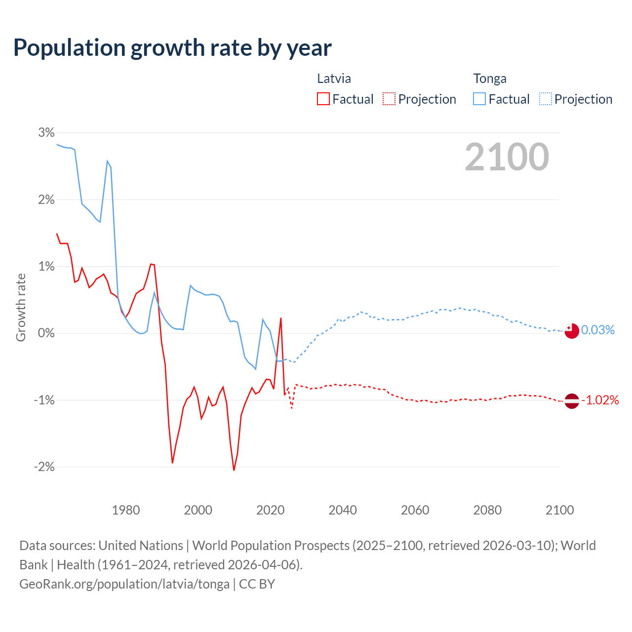 Latvia vs Tonga: population by year and forecast