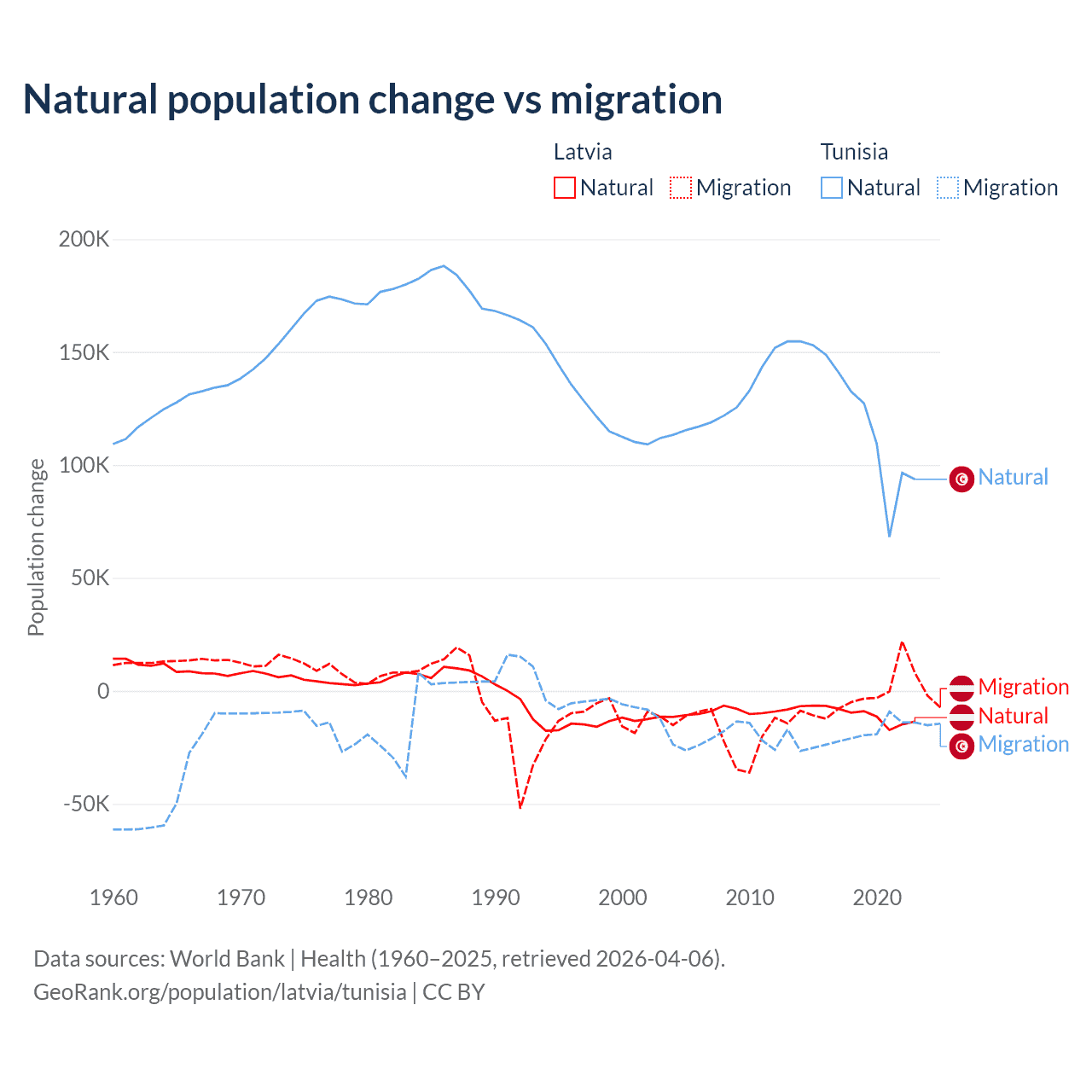 Over the last 10 years, 82.7% of the population change in Latvia is from natural causes (a loss of 103,711 people) and 17.3% is from migration (a loss of 21,641 people). In Tunisia 86.3% is from natural causes (a gain of 1,225,079 people) and 13.7% is from migration (a loss of 195,011 people).