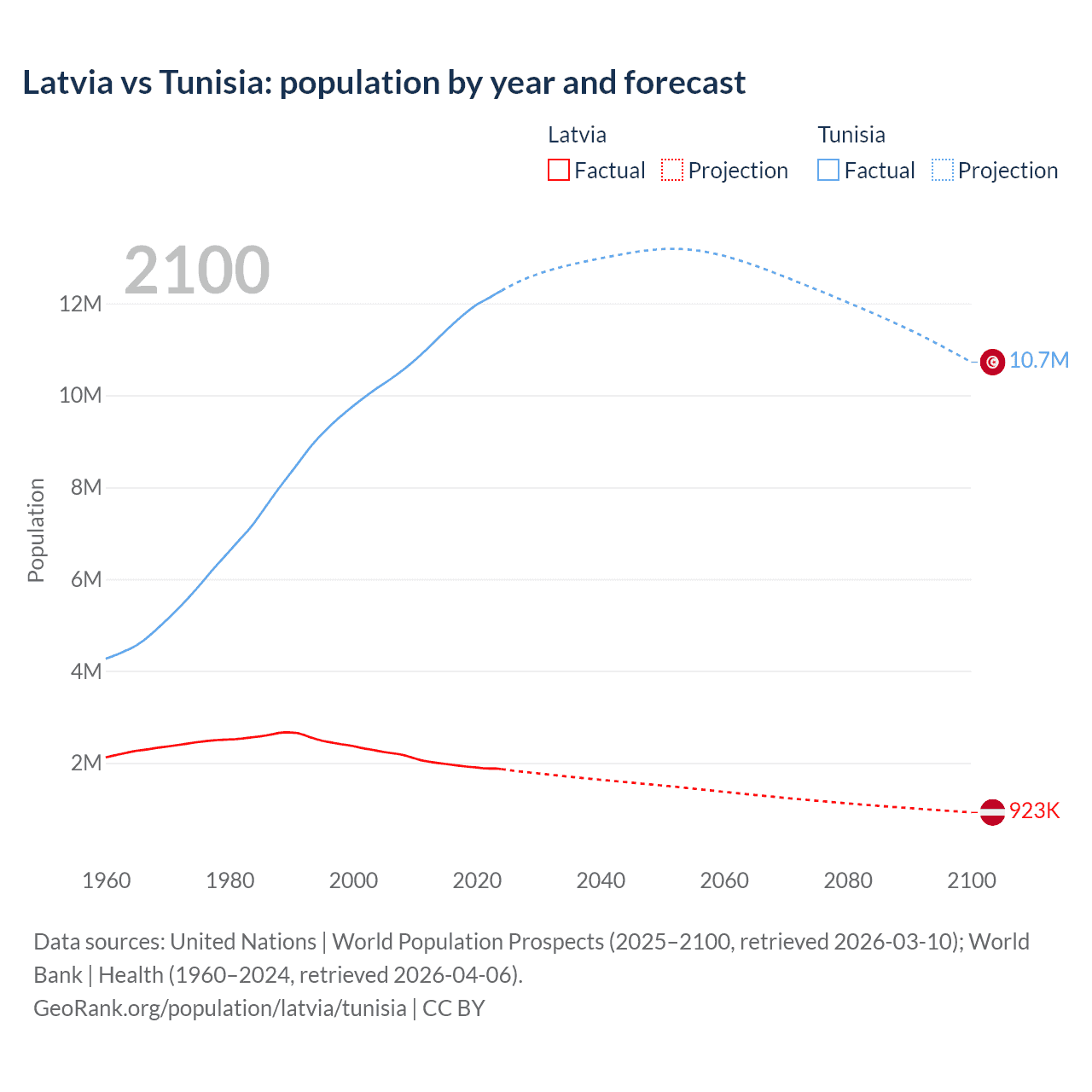 - Since 2006, the population of Latvia has decreased from 2.22M people to 1.83M (17.5% decline), while Tunisia has grown from 10.3M to 12.4M (20.2% growth).