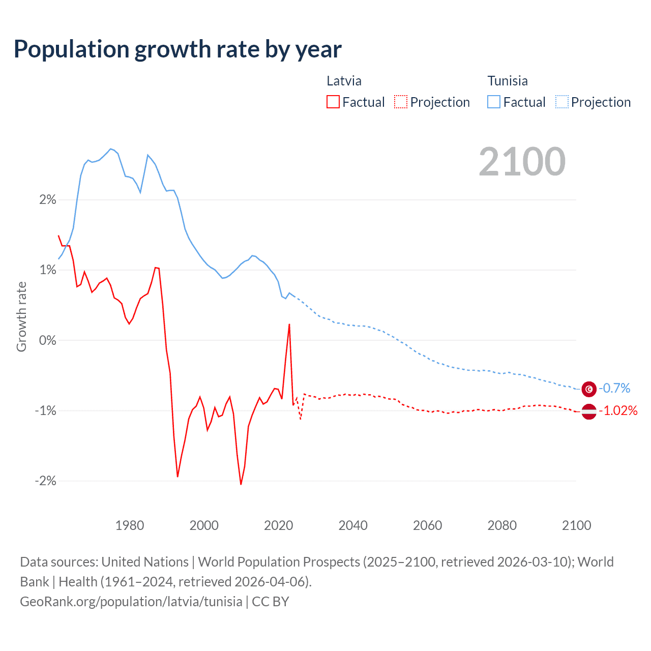 - For the last 10 years, Latvia has had an average growth rate of -0.68% per year vs +0.89% in Tunisia.