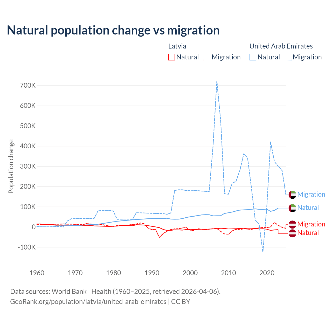 Over the last 10 years, 82.7% of the population change in Latvia is from natural causes (a loss of 103,711 people) and 17.3% is from migration (a loss of 21,641 people). In the United Arab Emirates 30.5% is from natural causes (a gain of 857,996 people) and 69.5% is from migration (a gain of 1,958,520 people).