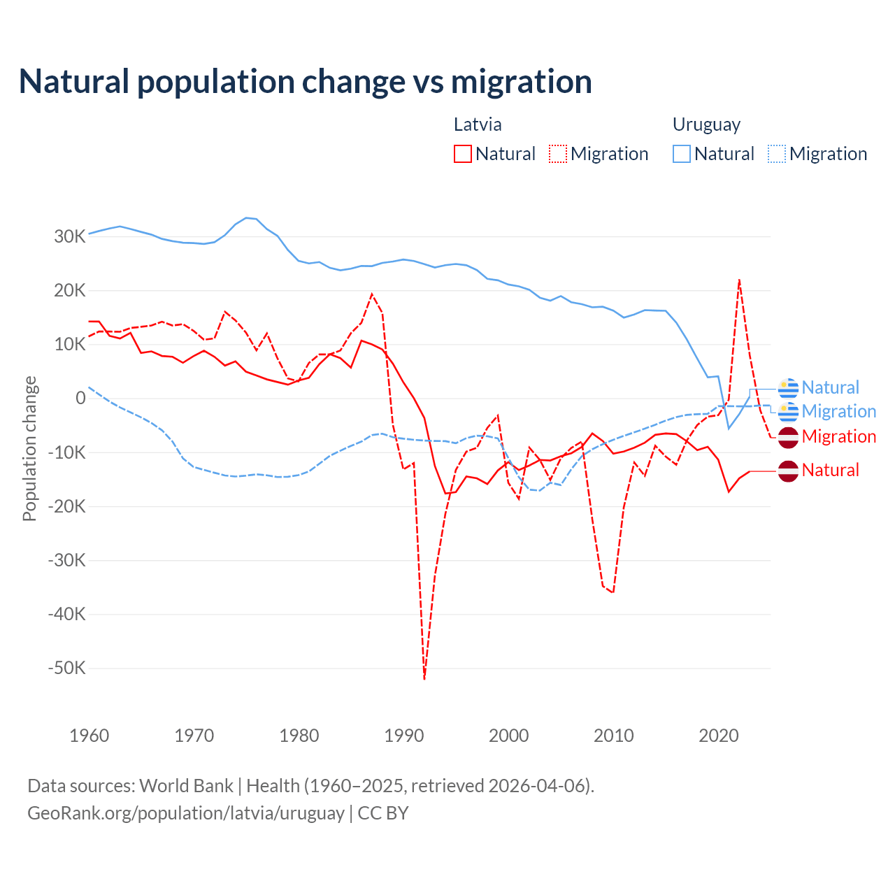 Over the last 10 years, 82.7% of the population change in Latvia is from natural causes (a loss of 103,711 people) and 17.3% is from migration (a loss of 21,641 people). In Uruguay 70% is from natural causes (a gain of 64,303 people) and 30% is from migration (a loss of 27,501 people).