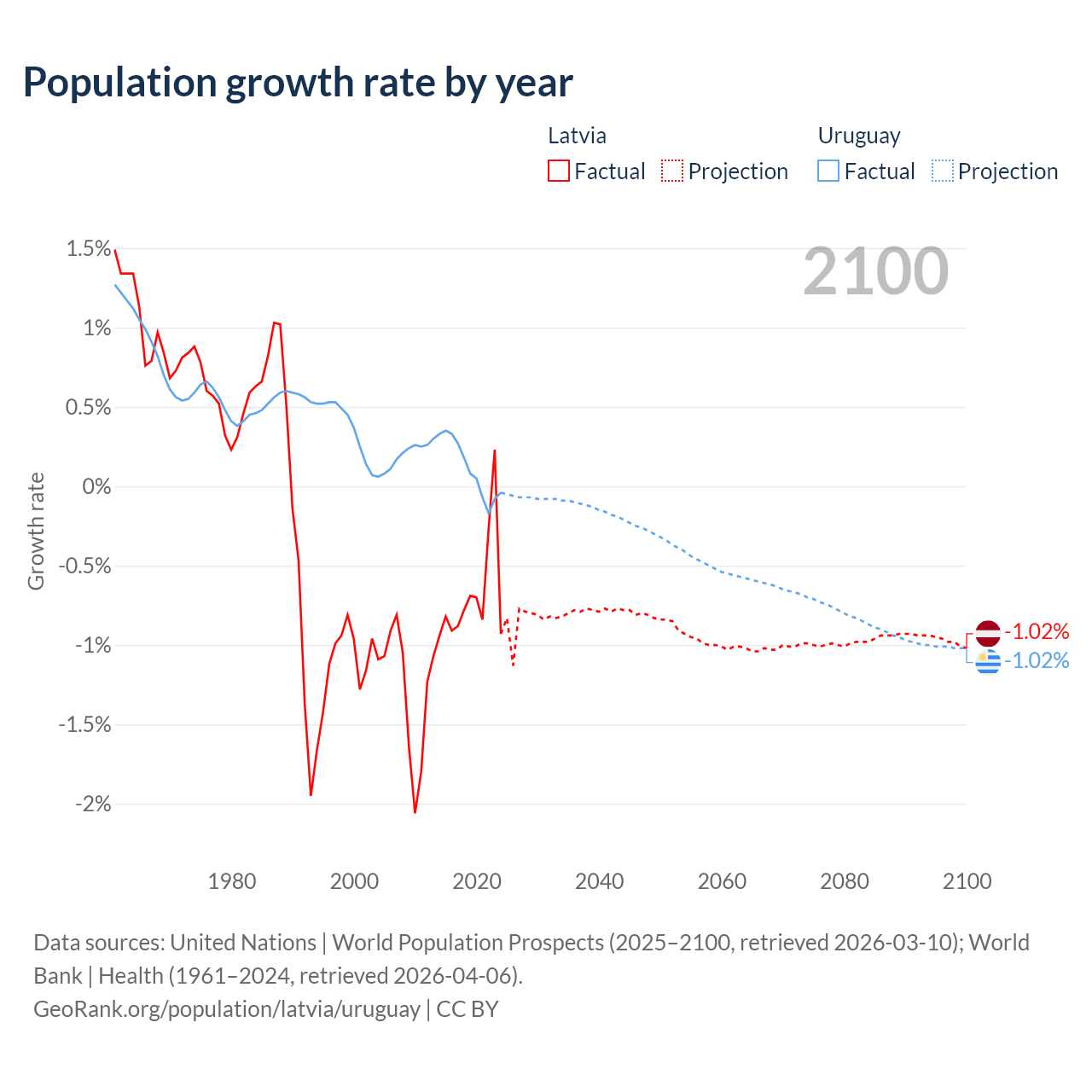 - For the last 10 years, Latvia has had an average growth rate of -0.68% per year vs +0.11% in Uruguay.