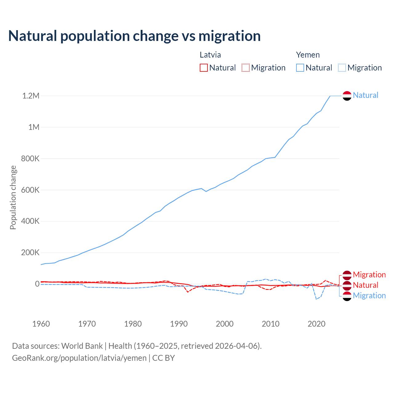 Over the last 10 years, 82.7% of the population change in Latvia is from natural causes (a loss of 103,711 people) and 17.3% is from migration (a loss of 21,641 people). In Yemen 97.8% is from natural causes (a gain of 10,460,813 people) and 2.17% is from migration (a loss of 231,814 people).