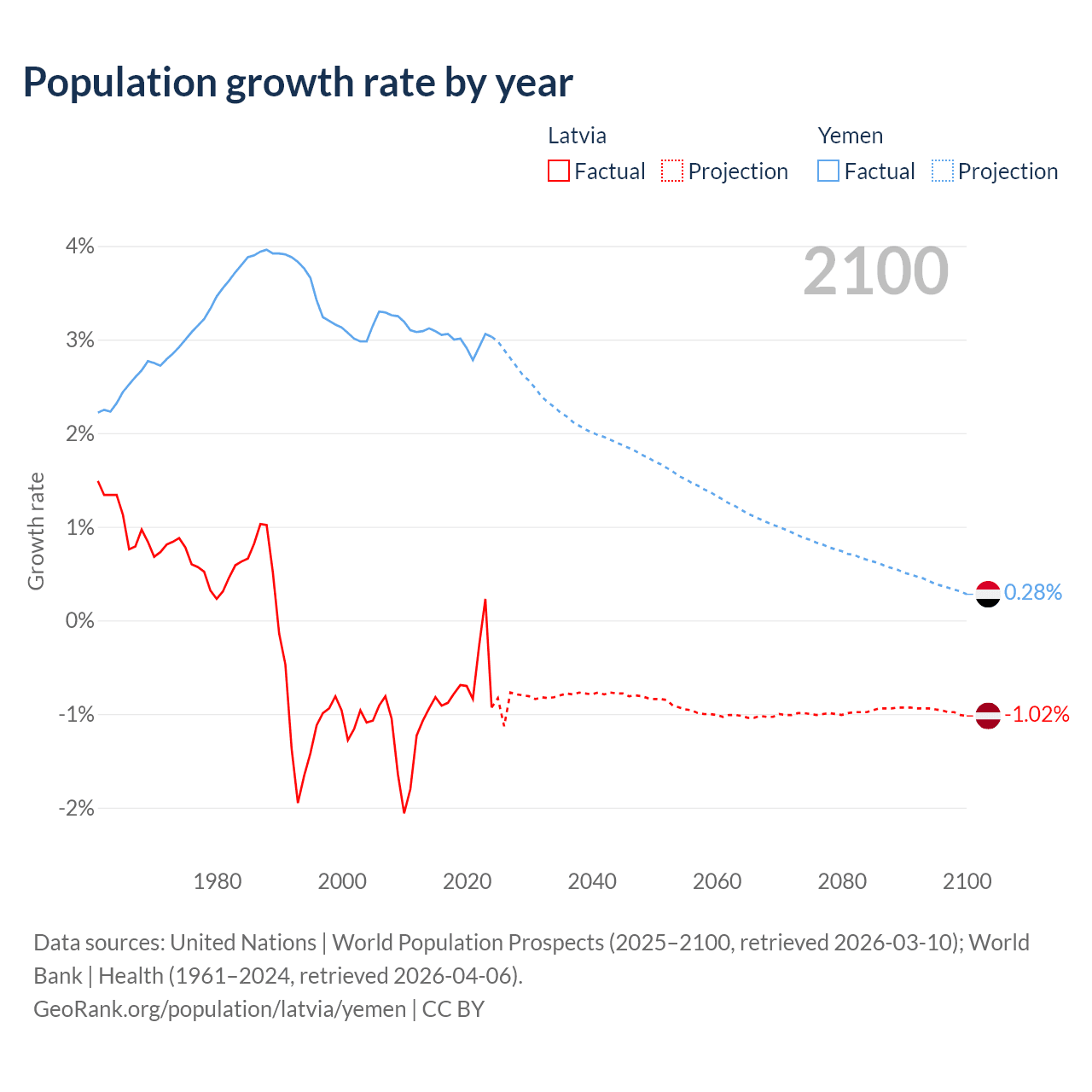 - For the last 10 years, Latvia has had an average growth rate of -0.68% per year vs +3% in Yemen.