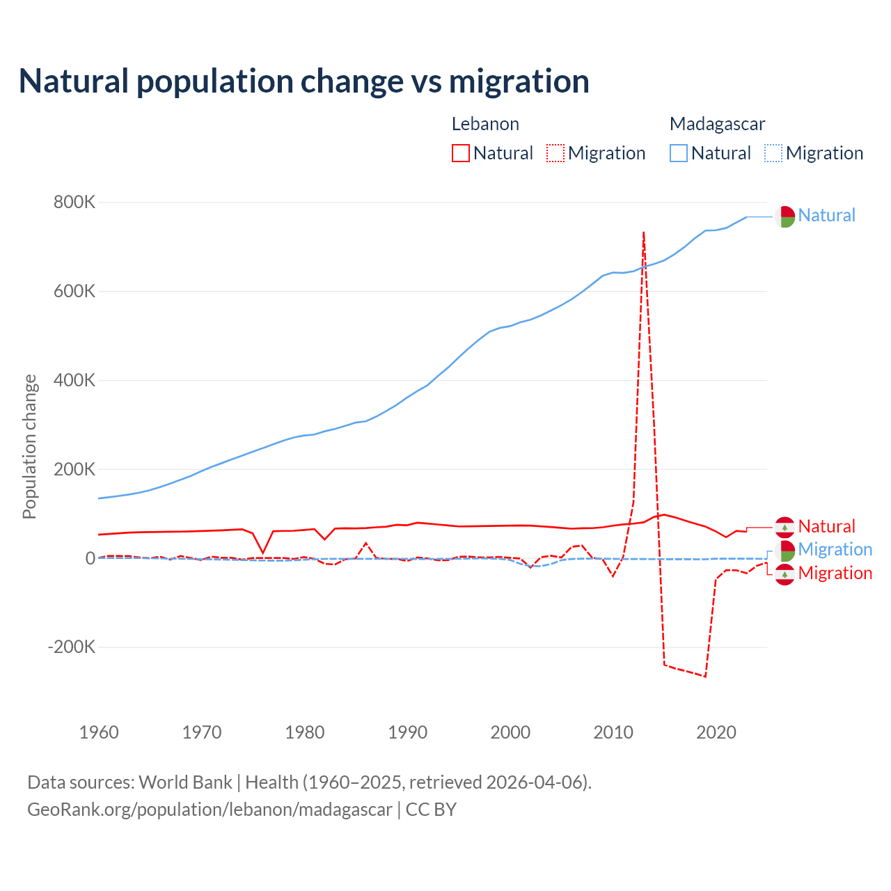 Over the last 10 years, 40.1% of the population change in Lebanon is from natural causes (a gain of 739,256 people) and 59.9% is from migration (a loss of 1,103,772 people). In Madagascar 99.7% is from natural causes (a gain of 7,165,578 people) and 0.31% is from migration (a loss of 22,384 people).