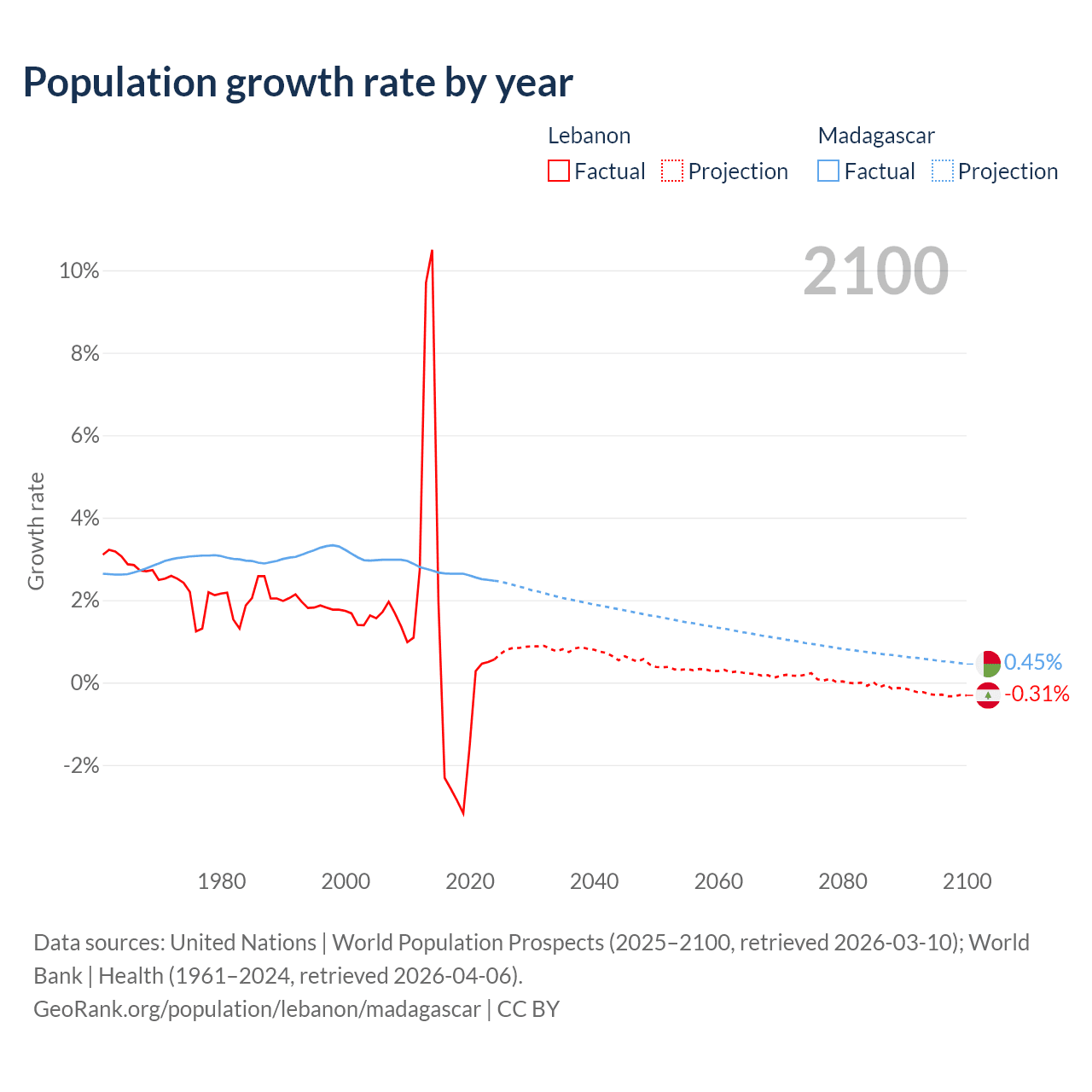 - For the last 10 years, Lebanon has had an average growth rate of +0.16% per year vs +2.6% in Madagascar.