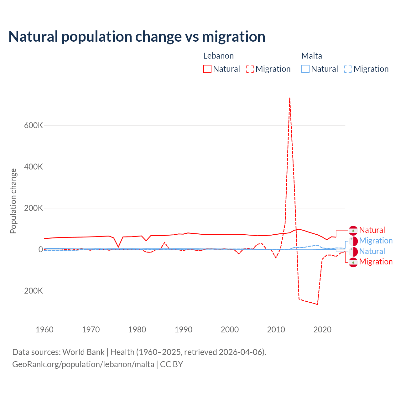 Over the last 10 years, 40.1% of the population change in Lebanon is from natural causes (a gain of 739,256 people) and 59.9% is from migration (a loss of 1,103,772 people). In Malta 5.84% is from natural causes (a gain of 6,181 people) and 94.2% is from migration (a gain of 99,652 people).
