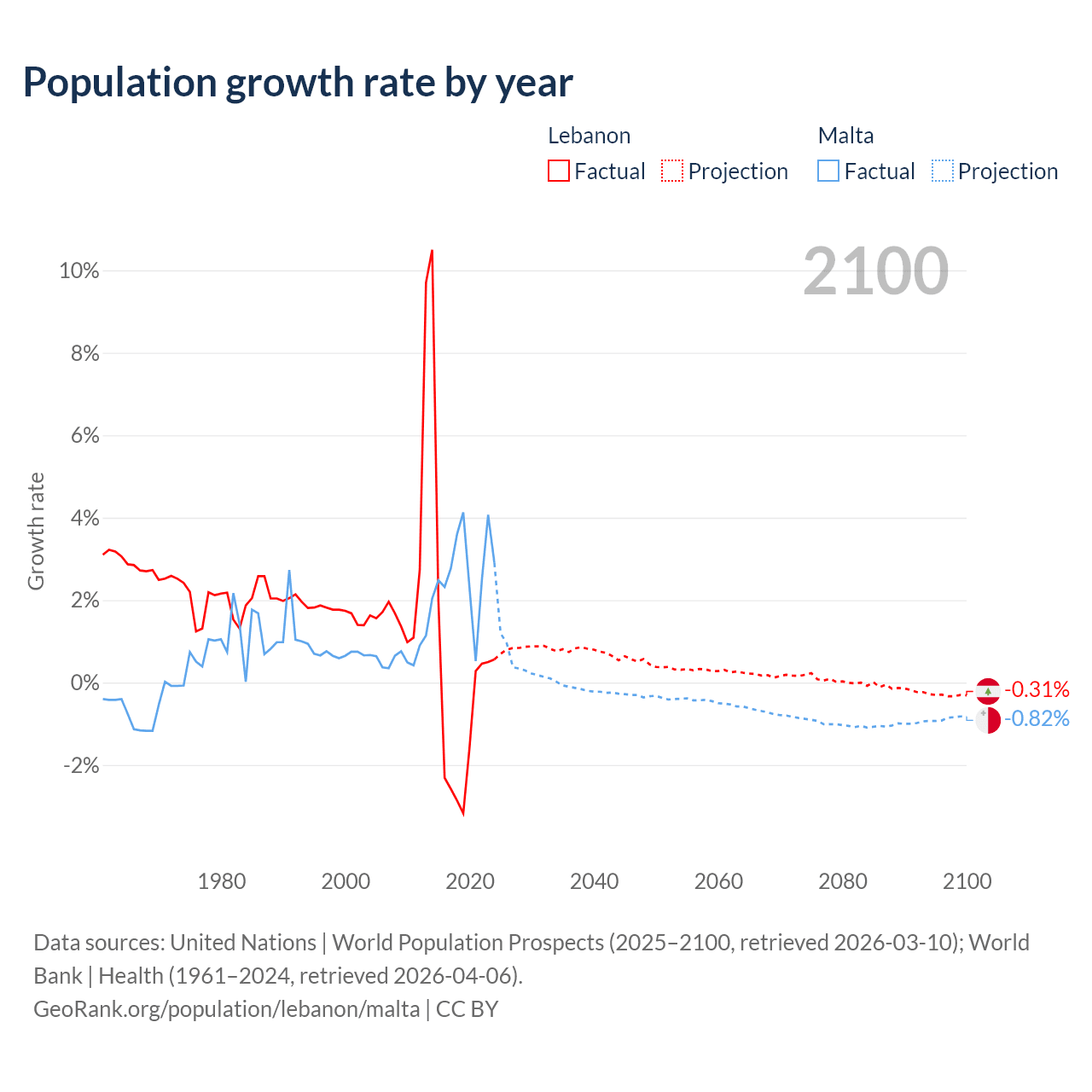 - For the last 10 years, Lebanon has had an average growth rate of +0.16% per year vs +2.69% in Malta.