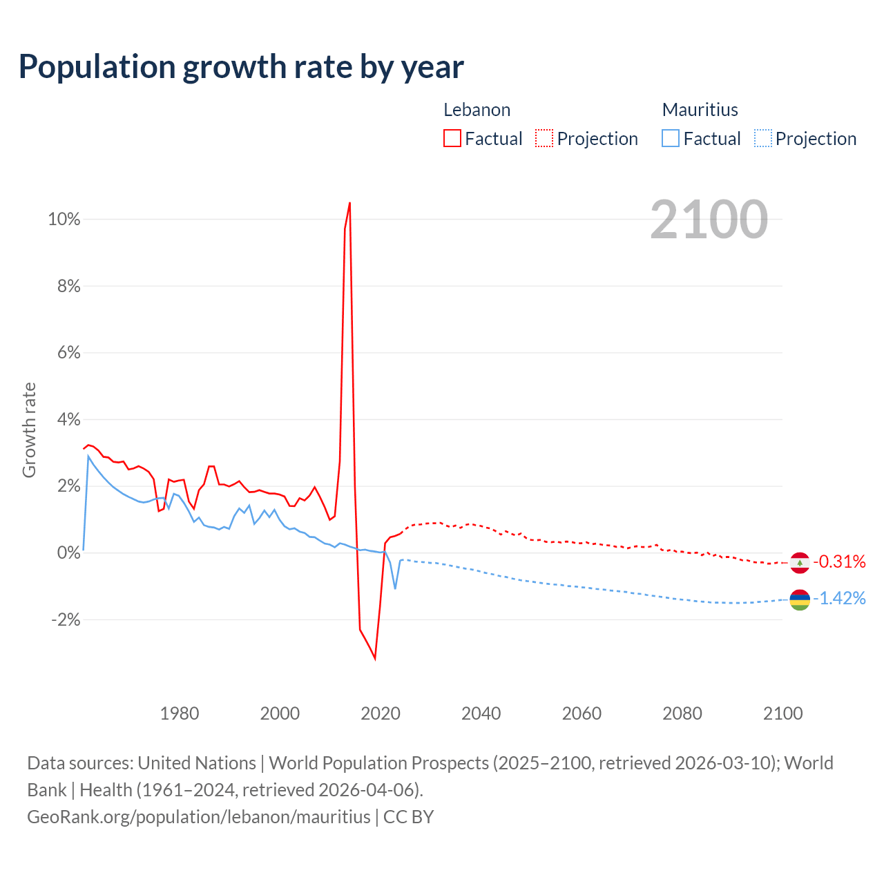 - For the last 10 years, Lebanon has had an average growth rate of +0.16% per year vs -0.09% in Mauritius.