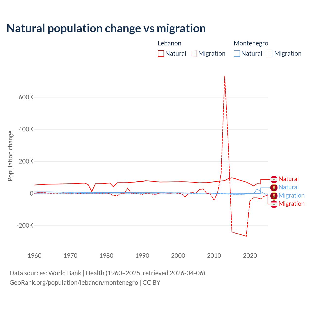 Over the last 10 years, 40.1% of the population change in Lebanon is from natural causes (a gain of 739,256 people) and 59.9% is from migration (a loss of 1,103,772 people). In Montenegro 52.4% is from natural causes (a gain of 4,501 people) and 47.6% is from migration (a gain of 4,095 people).