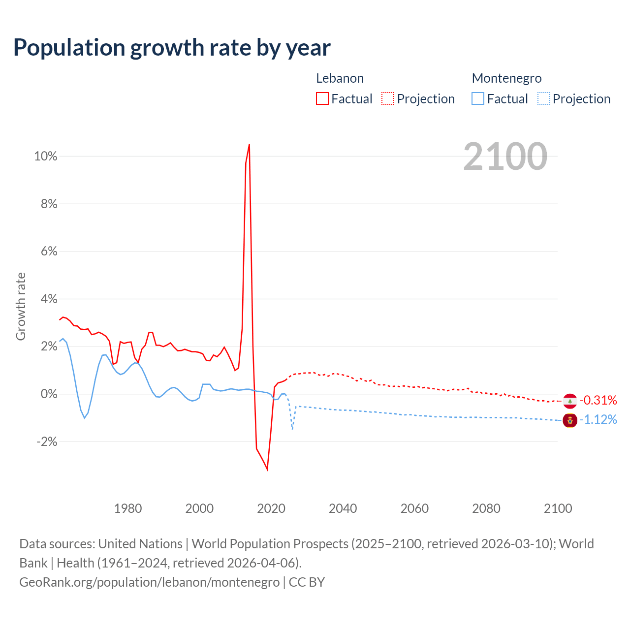- For the last 10 years, Lebanon has had an average growth rate of +0.16% per year vs +0.01% in Montenegro.